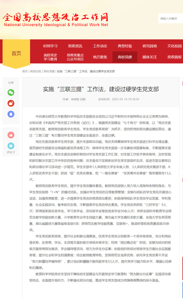 3月14日,全国高校思政网以“实施‘三联三提’工作法,建设过硬学生党支部”为题,推介304am永利集团学生党支部建设工作经验。