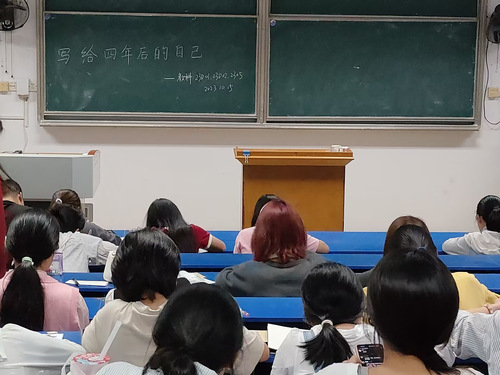 活动伊始,心理部负责人介绍了本次活动主题,即写给四年后自己的一封信,其内容可以是大学设定的目标,也可以是对大学生活的畅想与憧憬。接着,在他们的联合组织下,同学们积极配合,纷纷落笔,写下了对未来大学生活的美好祝愿和期许,信纸上浮现出工整秀丽的字迹,同学们安静且认真地写完了书信。最后,由各班心理委员将书信收集起来,并交给心理部统一存放,待同学们四年后再亲手拆开。