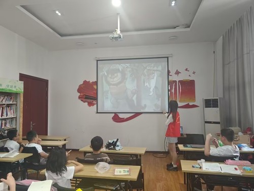 课程伊始,实践队员曾小函通过幻灯片逐页呈现绘本内容,声情并茂地带领孩子们共读文字。当故事情节推进至迈克斯从野兽国返程时,曾小函抛出问题:“是什么让迈克斯选择离开如同天堂般的野兽国?”孩子们各抒己见,有的推测他在野兽国已然尽兴,有的猜想他或许心生胆怯,还有的认为他可能疲惫了。随着情节发展,当屏幕出现“小船走了近一年”的画面时,有小朋友好奇迈克斯是在这一年是怎么生活的,并将目光投向曾小函。她并未直接作答,而借故事细节巧妙点出这是迈克斯的一场梦境,引导孩子们领悟故事的虚构性。