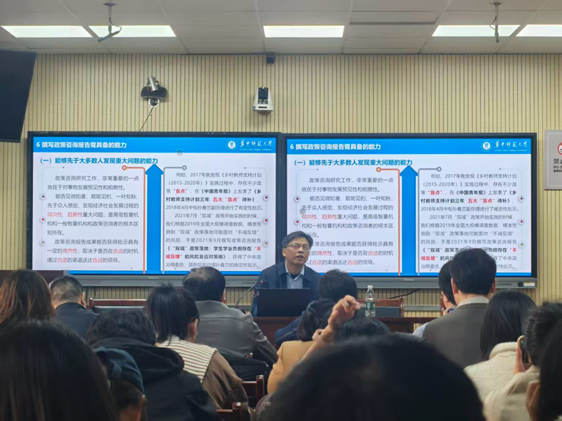 报告中,付卫东教授系统阐述了高质量政策咨询报告的写作要领。首先,付教授从什么是政策咨询报告、为什么要撰写政策咨询报告、政策咨询报告的特点与种类、政策咨询报告和学术成果的区别与联系等方面廓清了对政策咨询报告的认识;其次,结合他个人丰富的经历,阐述了撰写政策咨询报告需具备的能力和诀窍;最后,展示了四个政策咨询报告案例,使与会师生对政策咨询报告有了更深层次的理解。